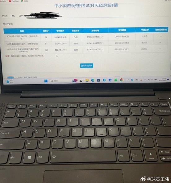 从王伟晒出的照片看,他的综合素质成绩为76分、教育知识与能力成绩为84分,体育与健康学科知识与教学能力成绩为83分。值得一提的是,王伟今年2月晒出过自己英语四级的成绩,他考了511分。