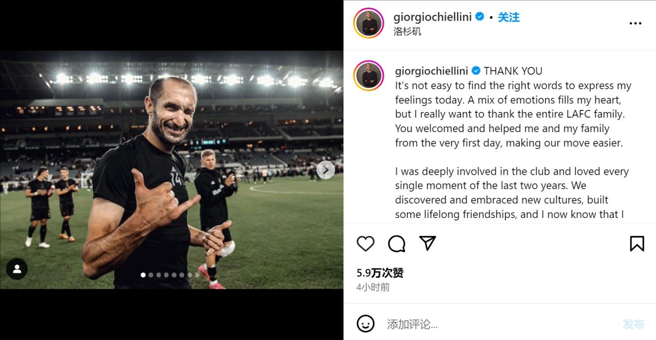 7月17日讯 基耶利尼今日在社媒发文告别洛杉矶FC。23年12月基耶利尼退役,随后在洛杉矶FC担任球员发展教练,今日告别洛杉矶FC。