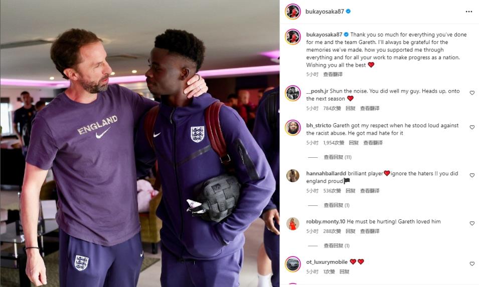 萨卡上传了自己和索斯盖特的合影,并配文写道:“加雷斯,非常感谢你为我和这支球队所做的一切,我将永远对我们所留下的回忆充满感激。”